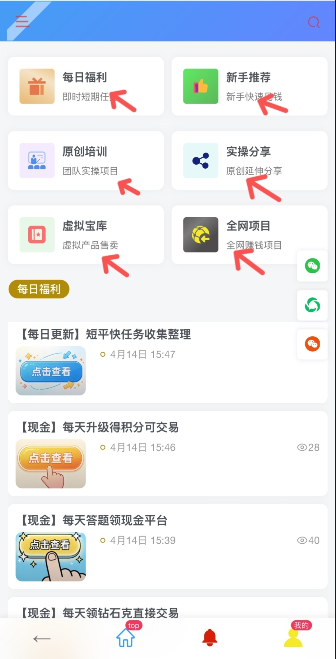 以上就是软件的大体情况,我简单概括下,每日福利、新手推荐和虚拟宝库,是可以直接变现的三大项目,原创培训和vip项目属于技能提升,适合想靠网络吃饭的人,通过网络副业改变只能拿死工资养家糊口的困境。