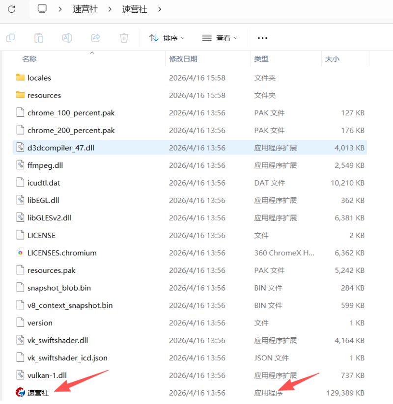 电脑端软件是免安装的,下载下来的是压缩包,解压好打开文件夹点击速营社即可运行,应用程序可以创建一个快捷键拖到桌面。