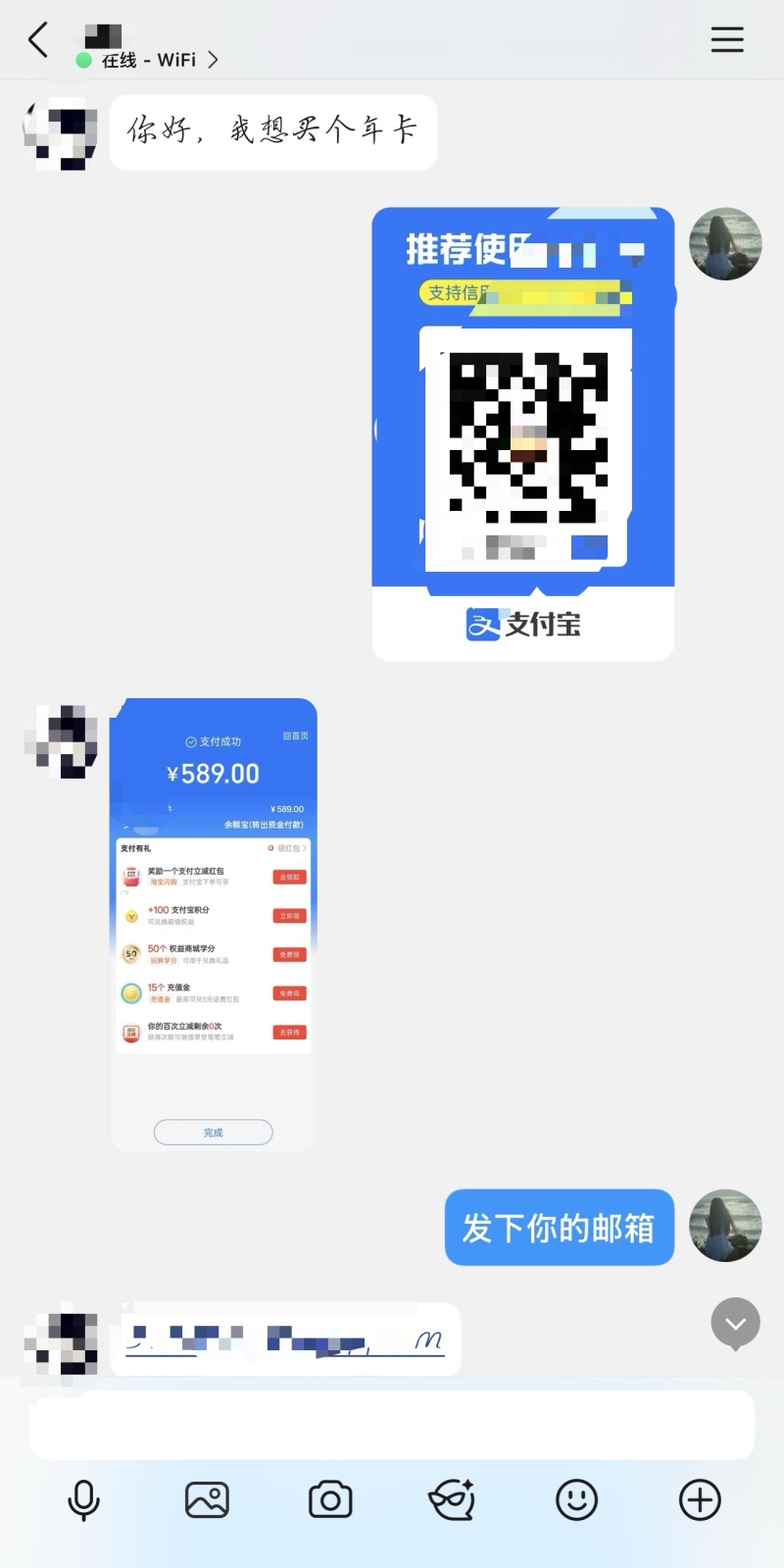 直接咨询客服扫码支付(备注:邮箱,如QQ邮箱)付款后5分钟内会发送到您预留的邮箱,付款后忘记预留邮箱的直接截付款截图给客服,客服会直接发你软件下载地址和激活码)